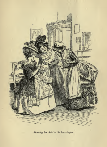 In this image Mrs. Palmer shows off her newborn baby to Mrs. Jennings housekeeper. Mrs. Palmer is Mrs. Jennings’ daughter, and she had a baby while Elinor and Marianne were staying in London with Mrs. Jennings. This scene occurs in chapter 42. The characters are shown in the traditional regency style. Mrs. Palmer, Mrs. Jennings, and the housekeeper wear regency style dresses with empire waistlines. Mrs. Palmer and Mrs. Jennings wear bonnets and the housekeeper wears a mop cap and an apron to protect her hair and clothes. The regency period dated to the early nineteenth century (1811-1820) when George, Prince of Wales, later George IV (r. 1820-1830), reigned as regent for his mentally ill father, King George III (r. 1760-1820). The regency period is associated with the rise of neoclassicism in art and fashion.