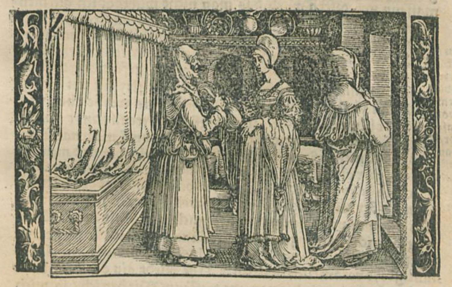 Celestina (leftmost figure) arrives at Melibea’s house, where she is greeted by Lucrecia (perhaps the rightmost figure), Melibea’s servant. As an old friend of Melibea’s mother Alisa (perhaps the rightmost figure), Celestina gains entry under the false pretense of paying her a visit and selling yarn. The servant of Alisa’s dying sister arrives and informs Alisa that her sister has requested her presence. Alisa departs, leaving Celestina alone with Melibea (central figure) and Lucrecia. She talks for a while with Melibea and eventually reveals that she is there on behalf of Calisto, which sends Melibea into a fit of rage. Celestina manages to quell her rage with a lie, telling her that Calisto’s cure requires only her girdle and a handwritten charm/spell. Melibea gives Celestina her girdle (as depicted in this illustration), and she asks Celestina to return the following morning to retrieve the spell.