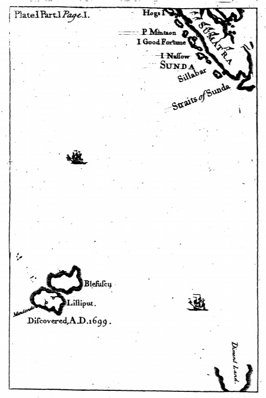 A map of depicting the fictional lands of Lilliput and Blefuscu that Gulliver visited in the first part of the story. Under the fictional lands is written Discovered, AD 1699. The map also depicts the lands of Sunda and Sumatra. Two ships – likely the man-of-war type ships which were popular in the eighteenth century and are mentioned in the text – are shown. The same map is featured in several other editions of the text, including those in other languages, such as German.