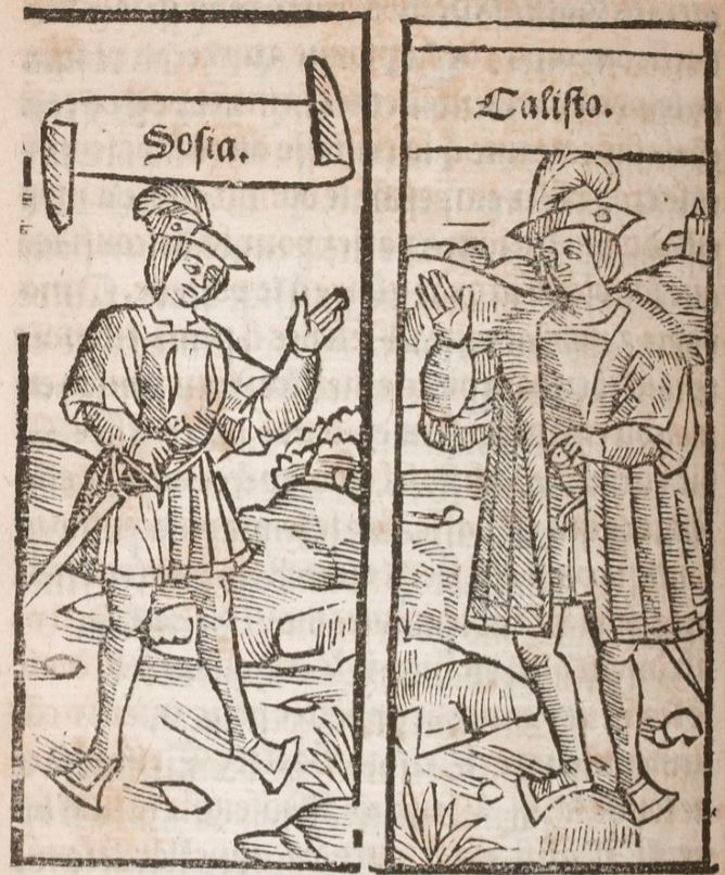The left panel depicts Calisto’s servant Sosia, who is wearing a hat and has a sword mounted on his belt. To the right, we see Calisto standing outside while wearing a hat. He also has a sword mounted on his belt, which is partially concealed by his coat. Both figures are placed outside.The left panel is identical to the one found on page 326, and nearly identical to those found on pages 60, 146, 173, and 187 (where it is labeled ‘Parmeno’), and page 299 (labeled ‘Pleberio’). The right panel is identical to the one found on page 271, and nearly identical to those found on pages 70 and 114 (where it is labeled 'Sempronio'), page 187 (labeled ‘Sepronio’ [likely a printing error]), page 326 (labeled ‘Tristan’), and page 350 (labeled ‘Pleberio’).