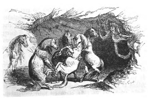 Here we see a group of Houyhnhnms carrying a deceased Houyhnhnm. They carry the body towards a cave that will serve as a tomb. This image appears when Gulliver explains the lifecycle of the Houyhnhnms and their burial rites. The same image appears in the 1839 Krabbe edition.