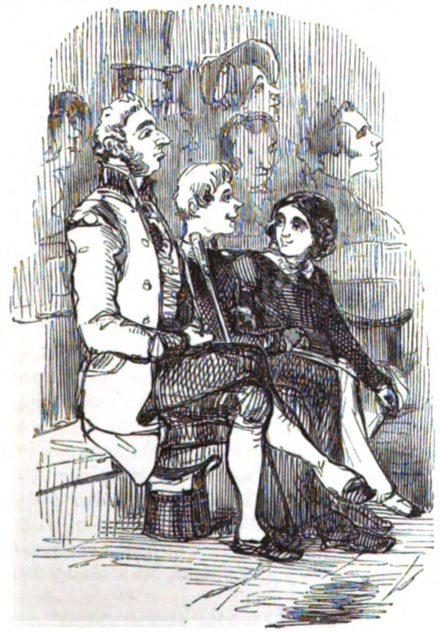 Georgy Osborne sits next to his friend Mr. Todd in the pit of the theater, where they are watching a play. Next to them is Mr. Rowson, Mr. Osborne’s footman and Georgy’s appointed servant, who is holding his cane and has placed his hat under the bench.