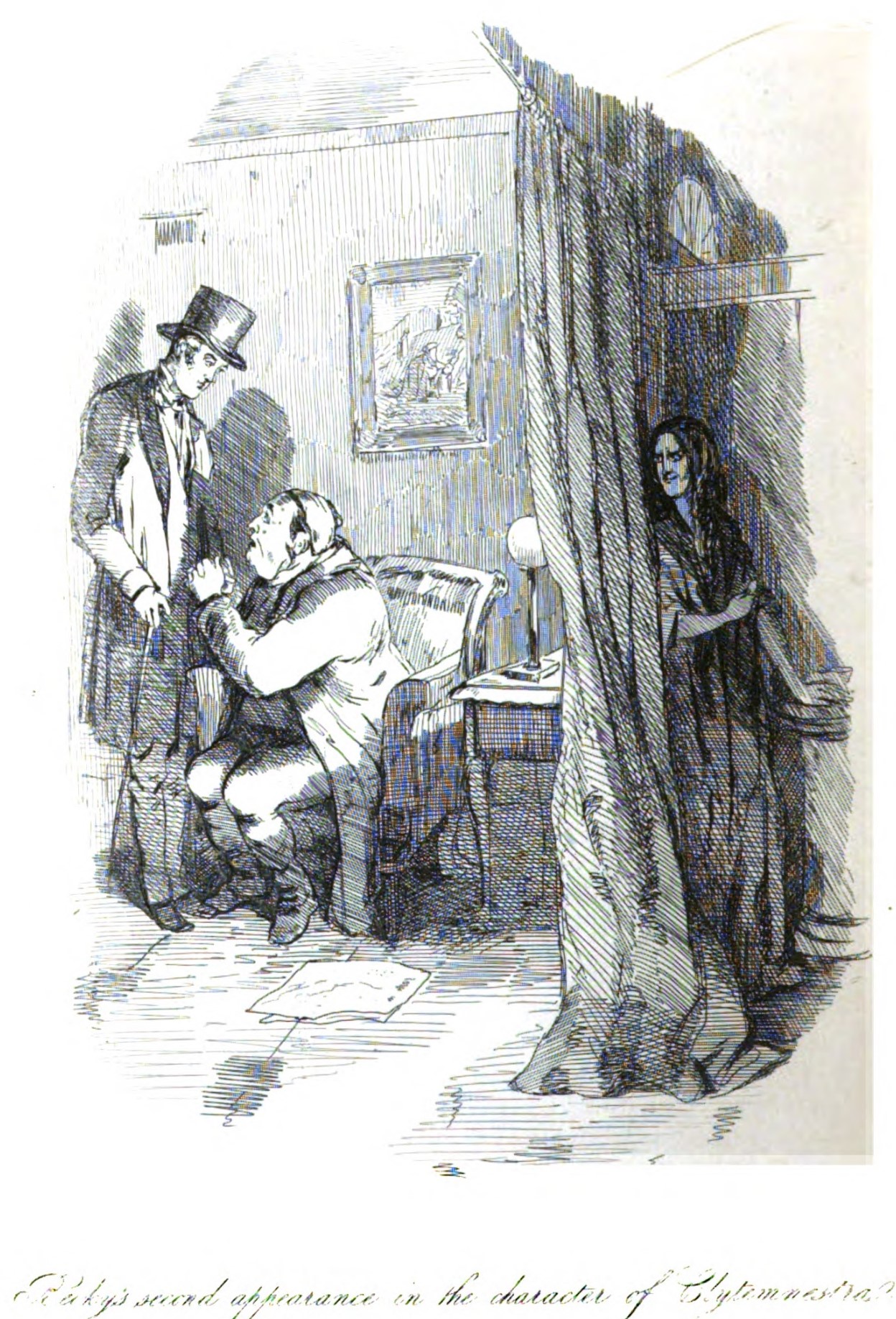 Joseph Sedley sits in a chair, begging William Dobbin, now his brother-in-law, to come and live near him, or else help him escape to India without Becky finding out. Dobbin was sent there by Amelia, who is worried about her brother after finding out that he has purchased a large life insurance policy. Behind a curtain on the far side of the room is Rebecca Crawley, listening in and holding a dagger in one hand. Below the illustration is printed in cursive its title, Becky’s second appearance in the character of Clytemnestra.