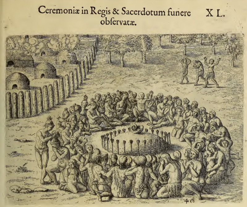 A large group of Indigenous people are shown clustered in a circle, most kneel or sit on the ground. The group appears to be openly mourning together. At the center of the circle there is a mound of earth surrounded by arrows planted tip first into the ground. A large shell sits on top of the ground. The ceremony is taking place outside the village close to the log fence encircling the village.