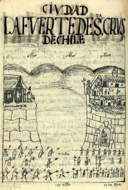 This image is depicted in the author’s chapter where he discusses cities, towns, villages, and provinces in colonial South America. The left side of the image depicts the indigenous pucara de chile [fortress of Chile] and the right side depicts the Spanish fuerte de cristiano del rrey [Christian fortress of the king]. The image depicts a battle between the indigenous population of Chile against the Christian Spaniards in Santa Cruz. There are three native soldiers standing atop their fortress under a small hut. The indigenous fortress displays large-stoned Incan architecture. The Spanish fortress depicts a cluster of European styled buildings which forms a square in the centre. There is a Spanish soldier standing on the edge of the fortress. At the base of both fortresses are Chilean native soldiers and Spanish soldiers preparing to battle with their spears. The word batalla [battle] is written in between both armies. A mountainous Andean landscape is illustrated in the background with birds flying over top.