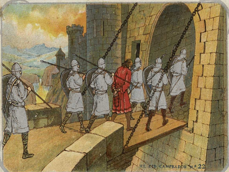 In this image there are six soldiers taking Don Garcia prisoner. The six soldiers are all wearing chainmail and carrying spears and shields. They are all wearing helmets. The prisoner is wearing a red tunic. They are all walking on a drawbridge to enter a castle. In the distance there are towers that are a part of the castle. Also, in the background a river is visible.
