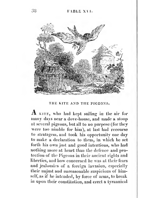 The Kite was sailing in the air, on the upper center of the illustration,near a dove-house, located at the bottom left. One pigeon was on top of the dove-house while another was ooutside of its gate. They both stared at the sailing Kite horror despite its declaration of peace. At the backgroung on the right, an other Kite was feeding on the pigeon.