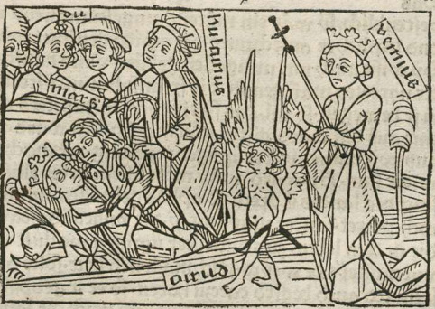 The goddess Venus is depicted on the right-hand side of the engraving wearing a crown and holding a scepter in her left hand. We can identify this figure as Venus as her name is engraved directly beside her. Her son, Cupid, is depicted walking alongside her with his bow and arrows in hand and his wings erected in the air. His name is engraved by his feet. The left-hand side of the engraving also depicts Venus as she commits adultery with her half-brother, Mars. Mars’ name is engraved just above Venus’ head. Boccaccio explains that Venus’ husband, Vulcan, had walked in on the adulterous crime, which is what the engraving is illustrating. Vulcan’s name is engraved behind him as Vulcanus. There are unidentified figures in the background of the engraving in the top left-hand corner. Boccaccio explains that Venus was highly adored in Cyprus as well as Rome, and he chose to write on her for her beauty. He criticizes her highly due to her invention of brothels.
