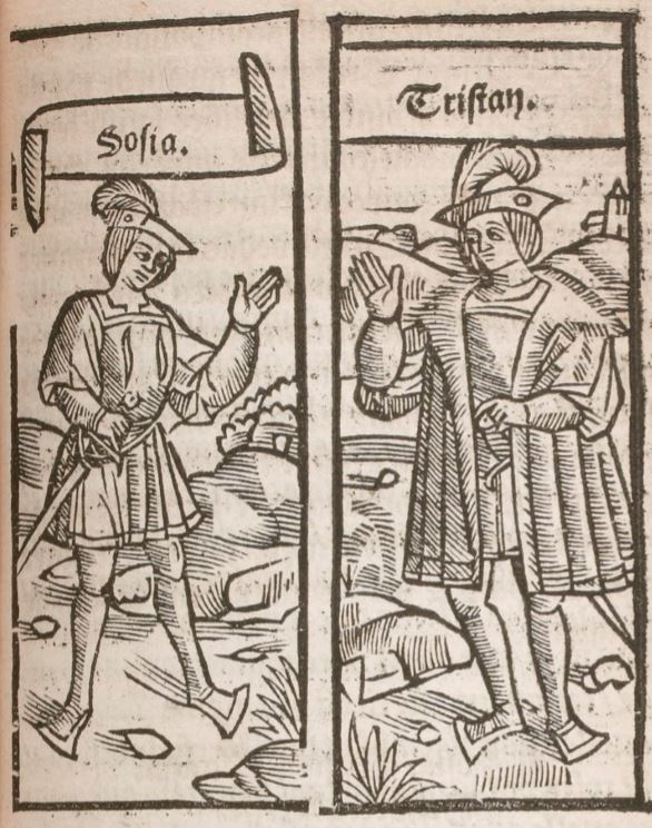 The left panel depicts Calisto’s servant Sosia, who is wearing a hat and has a sword mounted on his belt. To the right, we see Calisto’s other servant Tristan wearing a hat. He also has a sword mounted on his belt, which is partially concealed by his coat. Both figures are placed outside.The left panel is identical to the one found on page 263, and nearly identical to those found on pages 60, 146, 173, and 187 (where it is labeled ‘Parmeno’), and page 299 (where it is labeled ‘Pleberio’). The right panel is nearly identical to those found on pages 70 and 114 (where it is labeled ‘Sempronio’), page 187 (labeled ‘Sepronio’ [likely a printing error]), pages 263 and 271 (labeled ‘Calisto’), and page 350 (labeled ‘Pleberio’).