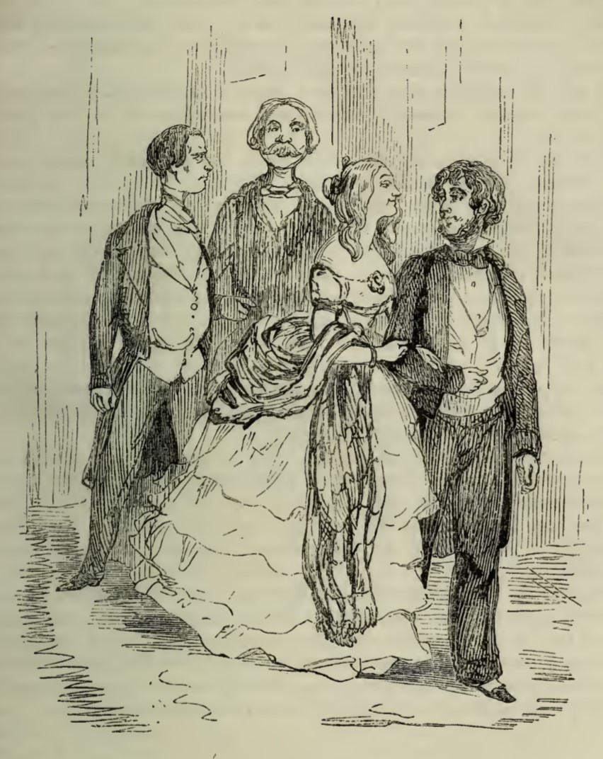 Rebecca Crawley walks into dinner on the arm of the Earl of Southdown. Behind them are her husband, Rawdon Crawley, and Mr. John Paul Jefferson Jones, from the American Embassy. Mr. Jones is scowling at Mr. Crawley, upset that he lost the chance to escort Mrs. Crawley.