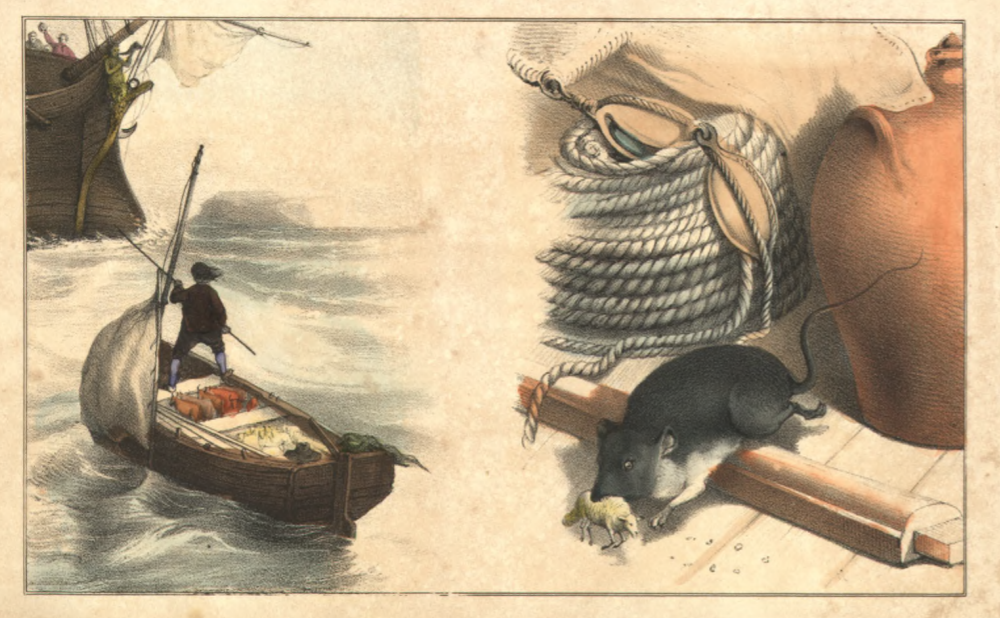 [Gulliver is rescued by an English ship and a Lilliputian sheep next to a rat]