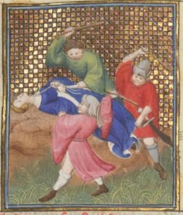 This illumination depicts the freedwoman, Epicharis, being tortured for information regarding a conspiracy to kill Emperor Nero. Epicharis is depicted lying on a large rock while three men attack her with clubs. Epicharis heard the details of the conspiracy to assassinate Emperor Nero, and when she put her faith in the wrong person, they told Emperor Nero that she was involved in the plan. They tortured her many times; however, she did not reveal the names of anyone involved in the conspiracy. She ended up killing herself to avoid revealing the details to the emperor.