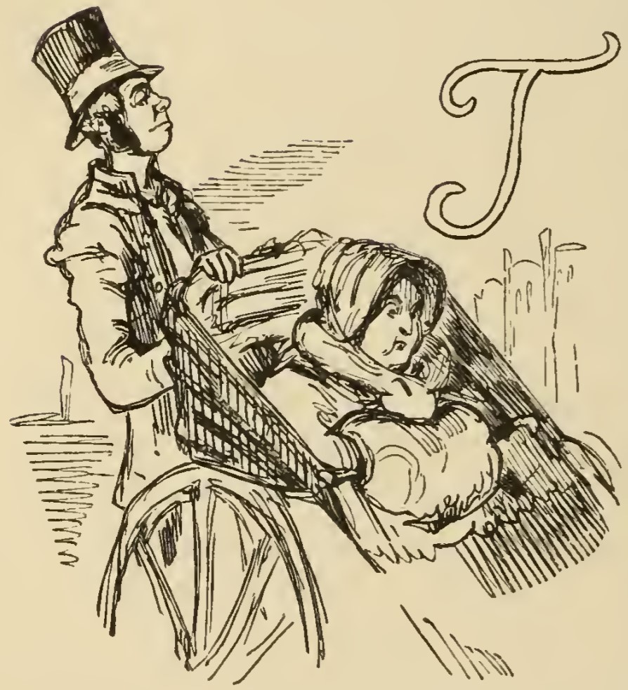 Miss Matilda Crawley sits in her wheelchair, bundled up in a bonnet and muff. The chair is being pushed by a thin man in a coat and tall hat. In the top right of the image is the letter T from The.