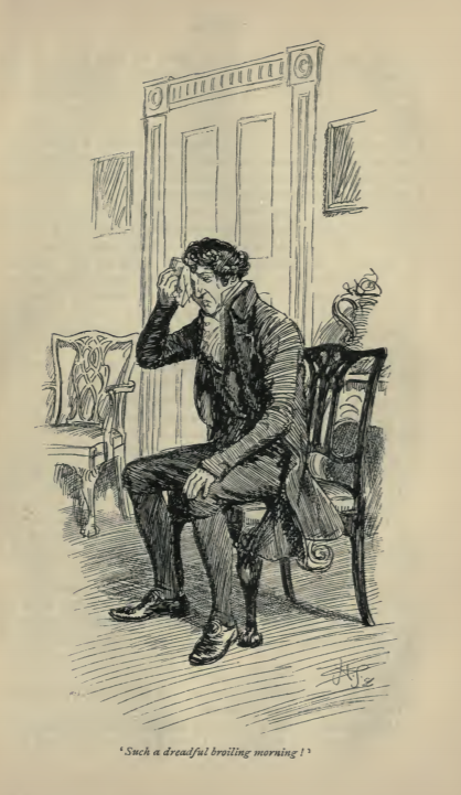 In this image Mr. Elton dries his brow with his handkerchief. He had gone over to Donwell Abbey but could not find him there. He was quite perturbed that he had walked all the way to Donwell only to find it empty. He met William Larkins, but he only said that he did not know where Mr. Elton could find Mr. Knightley. This scene occurs in chapter 52. The characters are shown in the traditional regency style. Mr. Elton wears a waistcoat and tailcoat with a cravat. The regency period dated to the early nineteenth century (1811-1820) when George, Prince of Wales, later George IV (r. 1820-1830), reigned as regent for his mentally ill father, King George III (r. 1760-1820). The regency period is associated with the rise of neoclassicism in art and fashion.