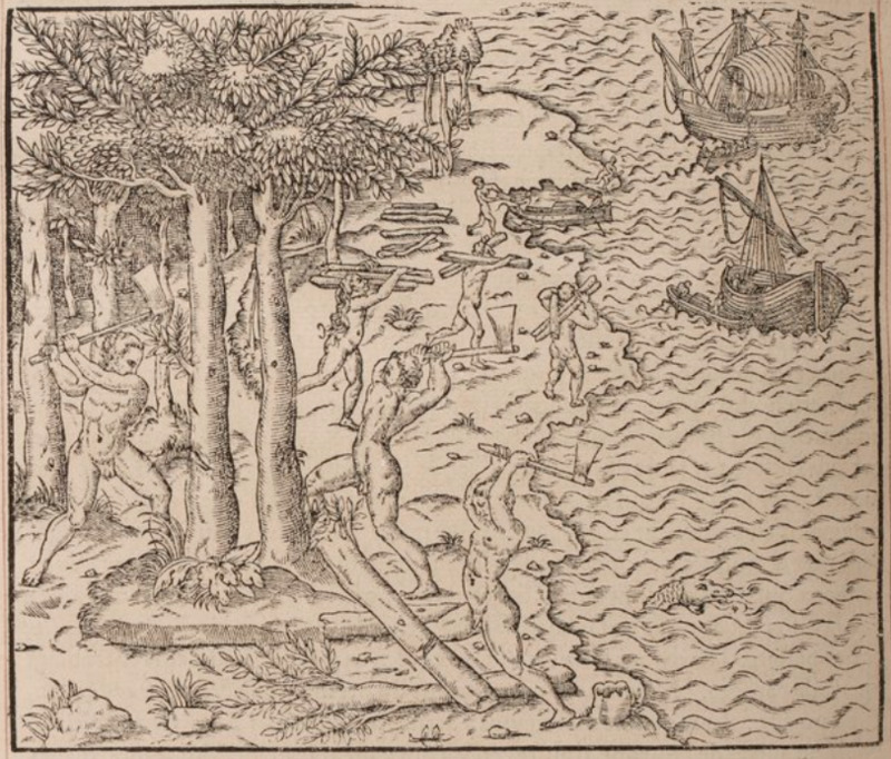 Several Indigenous men and women cut down brazilwood trees along the coast. They use axes to fell the trees, stack the logs into piles, then load the logs into rowboats to ferry them out to the larger European ships. Brazilwood was very popular in Europe in the 16th century and was mainly exported by the Portuguese with the help (and later, enslavement) of the Tupi people, although pirates and other European merchants also harvested and traded the wood. This image is identical to one found one page 950 verso of Paris, 1575 (l’Huillier).