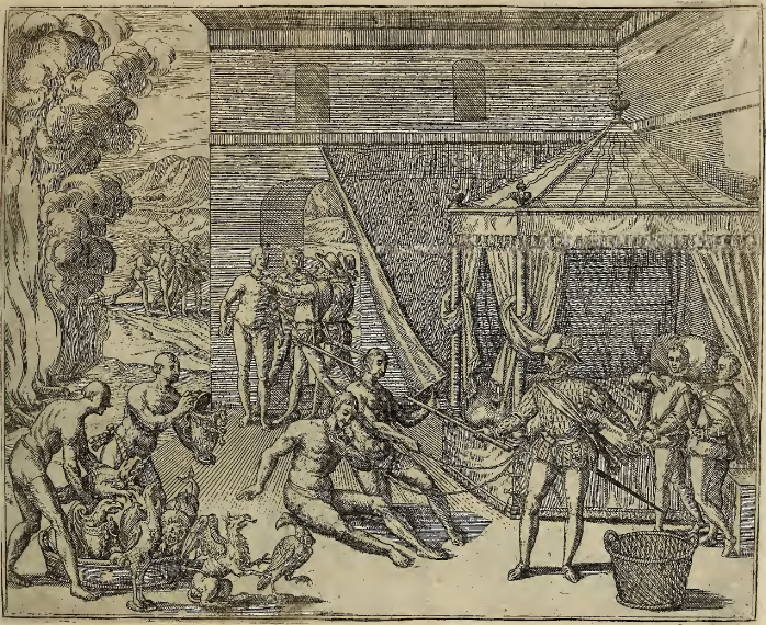 A group of Spaniards, one of whom is Diego Guttierez, governor of Costa Rica, takes at least four Indigenous leaders (Caciques) hostage and binds them in chains. Two of the Indigenous men have been bound by chains attached to the post of a large canopy bed inside the structure. Two others have been bound with chains around their necks, the ends of which are held by two Spanish men. On the left, two Indigenous men offer a basket full of exotic animals and vessels made of gold to the Spaniards. A large bonfire has been set on the left, and in the background two more Indigenous people walk towards the structure, escorted by two Spanish men.