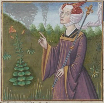 This illuminated image depicts a portrait of Medea, the daughter of king Aeetes of Colchis. Medea is pictured holding a scepter in her left hand and pointing with her right. Medea is well known for her involvement in magic and dealing with herbs. Boccaccio explains that Medea knew incantations to make winds gust, which is why there are depictions of a wind storm in the background of the image. There is a flower in the foreground beside Medea which symbolizes her skills in dealing with herbs for her magic.