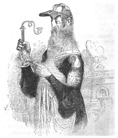 Here we see a scientist at the Grand Academy of Lagado on Balnibarbi. This is the first scientist Gulliver encountered. This scientist was attempting to extract sunbeams out of cucumbers, a project he had been working on for eight years. His goal was to be able to supply the governor’s garden with sunlight. The scientist has a long beard that is singed in several places and soot on his hands and face. He wears clothes with astronomical and scientific imagery, similar to what was worn on Laputa. He holds a beaker with a curved funnel. The same image appears in the 1839 Krabbe edition.