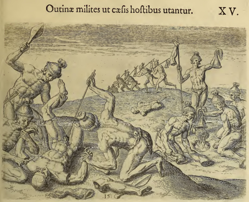 This image shows members of the Indigenous group led by Outina dismembering and scalping the deceased bodies of other Indigenous people from an enemy group.