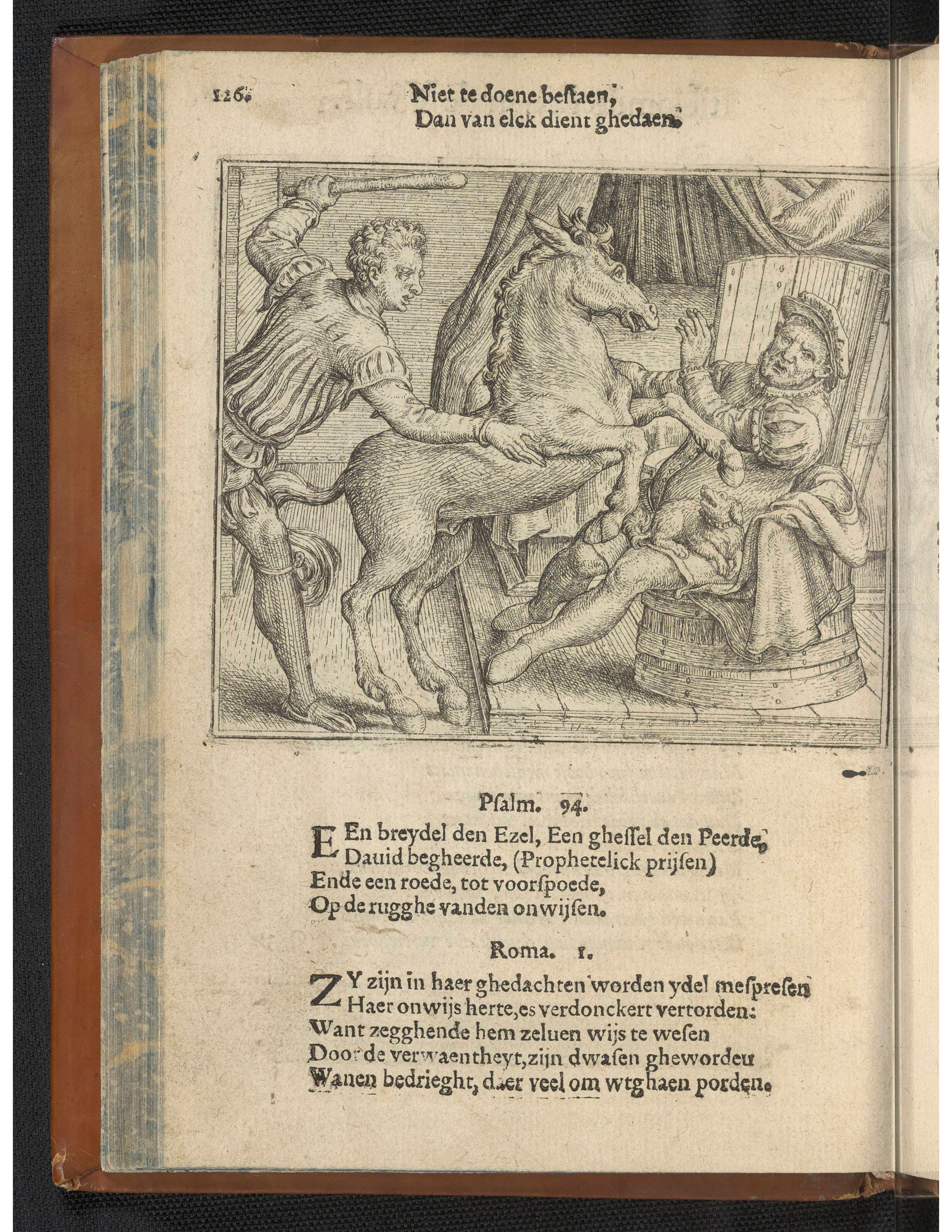 a man and a staggering donkey at left moving towards a seated man with a little dog on his lap at right; the seated man is scared of the donkey; the dog barks at the donkey; Dutch letterpress on verso; illustration to Eduwaert de Dene's edition of Aesop's Fables