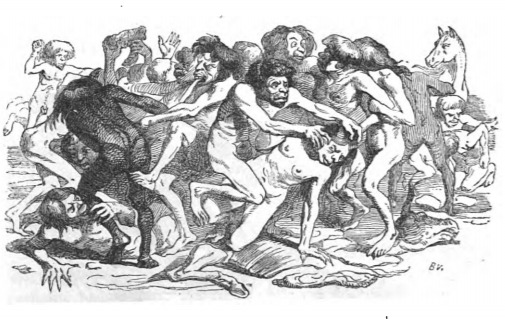 Here we see a group of Yahoos fighting each other. Gulliver’s master explains the relationships among the yahoos in the Country of the Houyhnhnms. Gulliver’s master says that the yahoos fight more than any other species, seen here. The same image appears in the 1839 Krabbe edition.