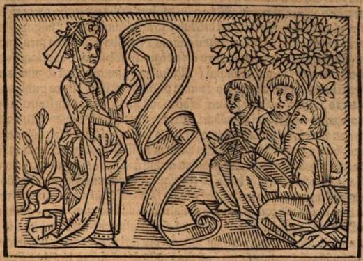 This engraving depicts Nicostrata, a woman who was a famous prophetess during her time, holding a scroll of parchment. Nicostrata had gone with her son, Evander, to Italy and he founded the city of Pallantium. Boccaccio explains that once Nicostrata realized that the inhabitants of this city were not well educated or literate, she decided to give them their own language with their own letters and symbols. This was the Latin language. Nicostrata taught the new letters and language to the people of Pallantium, which is what the engraving depicts. There are people sitting on the ground who are listening intently to the prophetess, as she is holding the parchment and teaching them the language. The citizens are also holding books as they listen to Nicostrata.