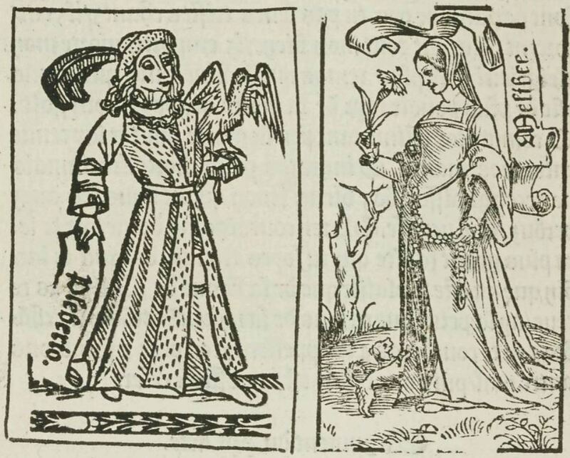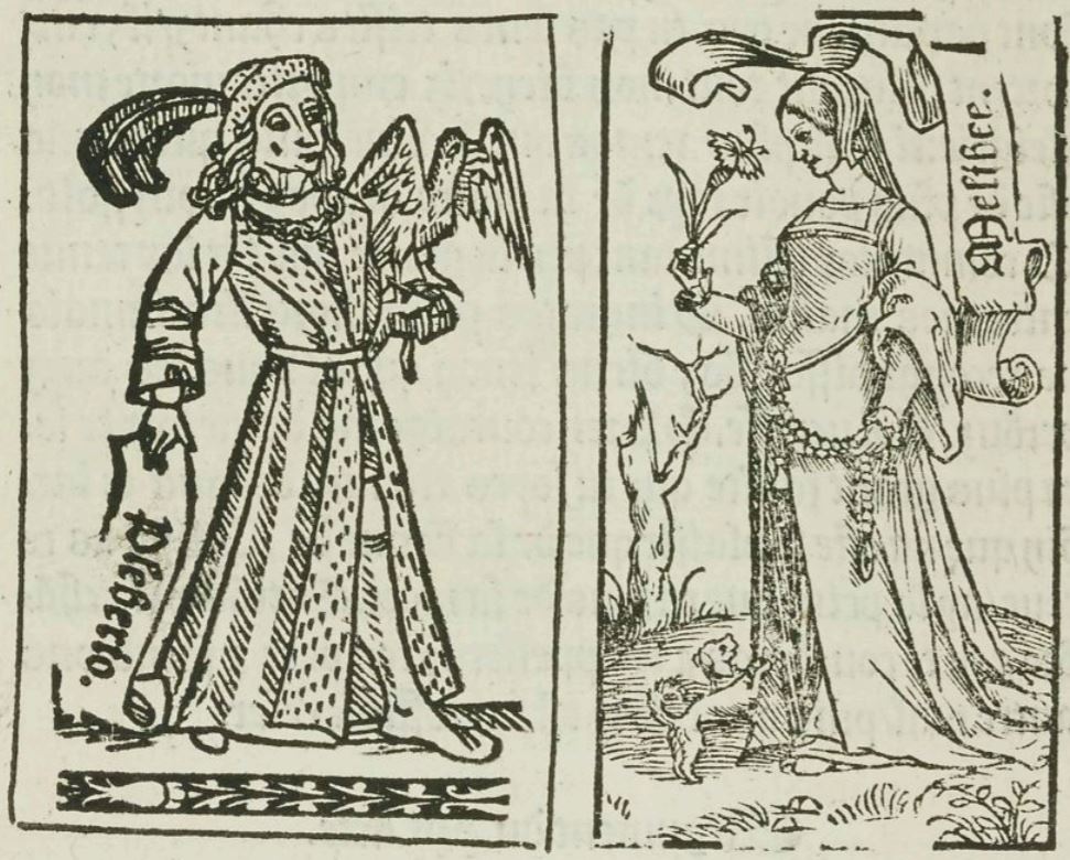 The left panel depicts Melibea’s father Pleberio, who is wearing regal attire and a large chain. This panel was first used to represent Calisto, which explains the falcon perched on his left arm. (It is odd that the printer would use this panel to represent someone other than Calisto.) On the right we see Melibea, who is wearing a robe and a veil. In her left hand she is holding the girdle cord that she gave to Celestina earlier in the story. In her right hand she has a flower, which she appears to be holding in front of her face (perhaps intended to express her modesty). A small dog stands at her feet, perched on its two hind legs while extending its front paws toward her. The left panel is nearly identical to those found on pages 88 (where there is no decorative panel and it is labeled ‘Calisto’), 135 (where the label is changed to ‘Sepronio’ [likely a printing/engraving error]), 170 (where there is no decorative panel and it is labeled ‘Calisto’), and 216 (where there is no decorative panel). The right panel is identical to those found on pages 8, 150, and 196.