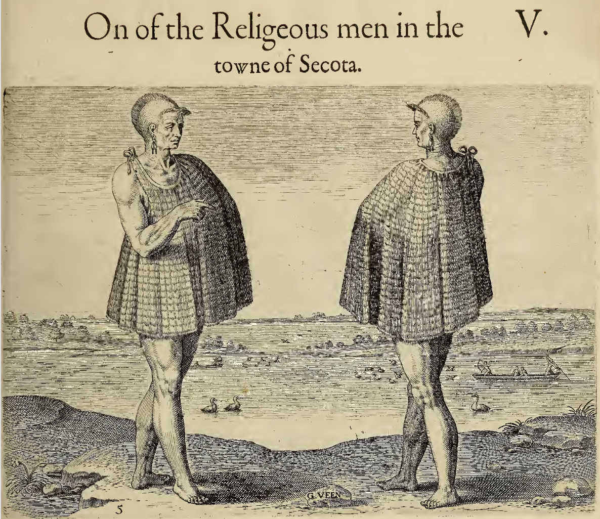 An Indigenous man (a shaman/priest/religious man) is shown standing on the bank of a river, from the front and from behind. He wears a cape-like garment, is barefoot, and wears no other adornment. In the river behind him, other Indigenous people are shown in canoes.