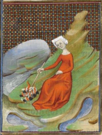 Manto, the daughter of the famous seer Tiresias, is depicted sitting in the centre of the image. She is depicted poking a stick into a fire as she looks through a pile of animal entrails. She used the movement and colour of the fire’s flames to tell the future, which is why there is a fire in the image. She also used the entrails of animals such as sheep and oxen for signs of the future.