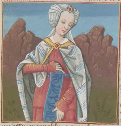 This illuminated image depicts a portrait of Libya, the daughter of King Epaphus of Egypt. She appears to be dressed in royal garments as she holds a piece of fabric with foreign lettering on it. Boccaccio explains that Libya bore a child with her husband, Neptune, who grew up to be a tyrant of Upper Egypt. Their child’s name was Busiris. Libya was so renown during her time that the region in Africa which she ruled was named after her.