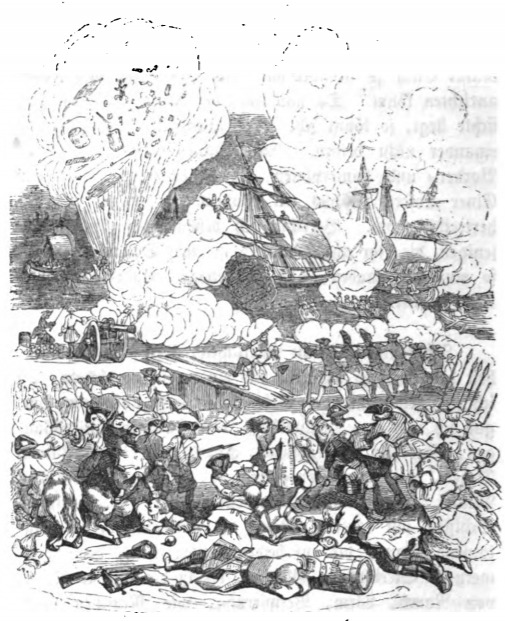 Gulliver explains how war works in Europe to his Master. Gulliver describes cannons, muskets, pistols, bullets, gunpowder, bayonets, sieges, battles, retreats, attacks, bombardments, sea battles, horses’ roles on the battlefield, and the various ways soldiers die on the battlefield. Several of these elements are shown in this image, including naval warfare, cannons, soldier’s deaths. The same image appears in the 1843 Krabbe edition.