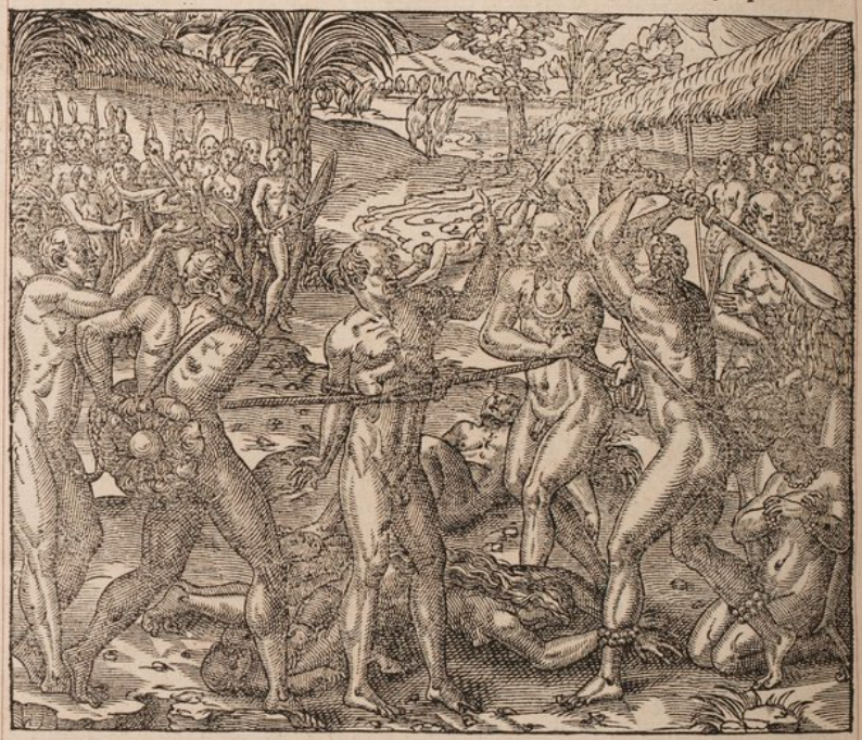 An Indigenous man has been taken captive by another Indigenous group and is about to be executed. He is restrained by a rope tied around his waist, with each end of the rope held taut. The captive gestures emphatically with one arm, perhaps in admonishment. Another man stands in front of him holding a club raised over his head, poised to swing. A woman and child lie prostrate on the ground behind the captive. Groups of people stand on either side of the captive to watch the execution, most of the men holding bows, clubs, and/or shields. Several structures are visible in the background. This image is identical to one found on page 945 verso of Paris, 1575 (l’Huillier).