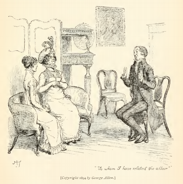 In this image Mr. Collins calls on Lady Catherine de Bourgh and her niece. Mr. Collins came to call after hearing of Lydia’s running away with Mr. Wickham. He then wrote to the Bennets to offers his condolences, spending the majority of his time talking about how Lydia’s behaviour threatens her sister’s prospects. In this letter Mr. Collins relates that Lady Catherine agrees with him. This scene occurs in chapter 48. The characters are shown in the traditional regency style. Lady Catherine and her niece wear regency dresses with empire waistlines. Lady Catherine wears an elaborate bonnet. Mr. Collins wears a waistcoat and tailcoat. The regency period dated to the early nineteenth century (1811-1820) when George, Prince of Wales, later George IV (r. 1820-1830), reigned as regent for his mentally ill father, King George III (r. 1760-1820). The regency period is associated with the rise of neoclassicism in art and fashion.