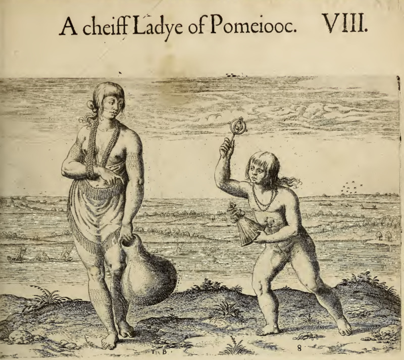 An Indigenous woman, a chief, is pictured standing on the bank of a river. Her hair is knotted at the nape of her neck, she wears several strands of beads around her neck, and her right wrist is cradled in the beads. She wears a fringed skirt around her waist and is topless and shoeless. She holds a large pot/container in her left hand. Beside her is a child, nude except for two strands of beads around their neck. The child holds a doll dressed like an English lady in one hand, and an object similar to a rattle in the other. Behind the pair, other Indigenous people are seen in canoes.