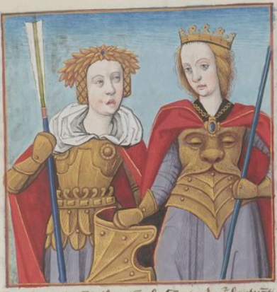 This illuminated image depicts the Orithya and Antiope, sister queens of the Amazons. They are illustrated wearing chest plates for armour and holding what appears to be either scepters or spears in their hands. The queen on the right side of the image is holding a girdle in her right hand. This girdle ends up being one of Hercules’ twelve labours.