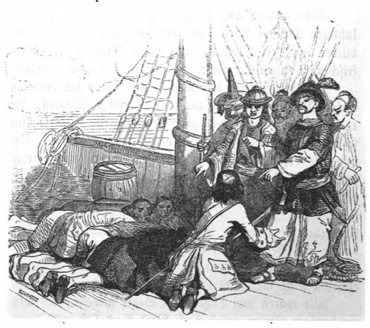 [Gulliver begs for mercy from the captain of a pirate ship]