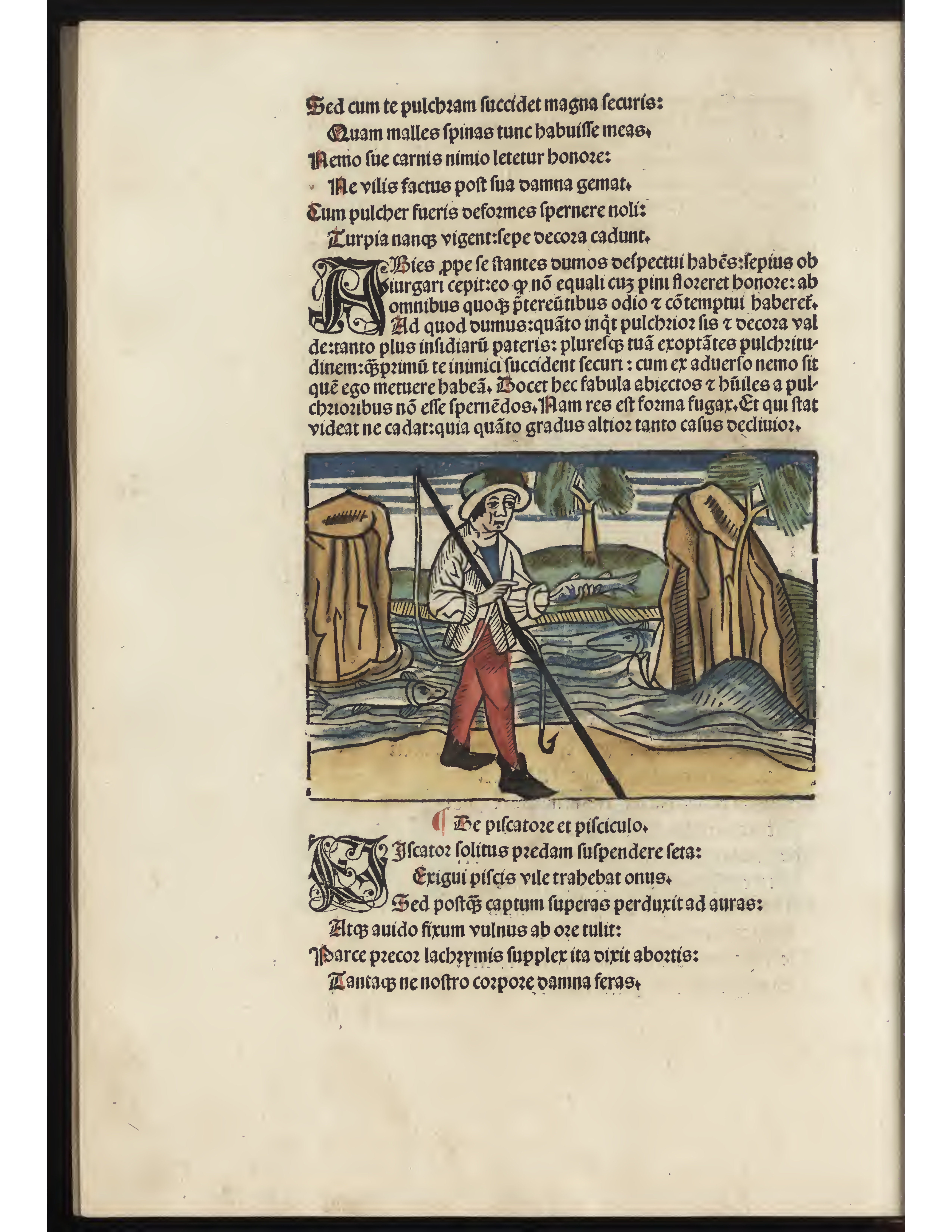- A fisherman holding a fishing rod is standing outside next to a river. The man is holding a fish in his left hand. Two more fish are swimming in the river.