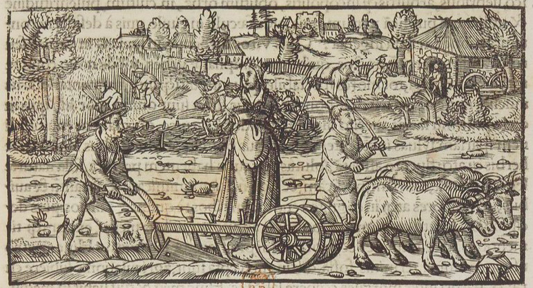 Ceres, the goddess of the harvest, stands in the middle of the photo. Ceres was the queen of Sicily, and was the first of the Sicilians to tame and train oxen to pull plows and plowshares, which she invented. The plows were used to prepare the ground for agriculture, as well as plant seeds. Her inventions are represented in the photo as she stands between two men, instructing them on how to use the oxen for plowing. In the field behind her, others are cutting down crops and leading livestock around.