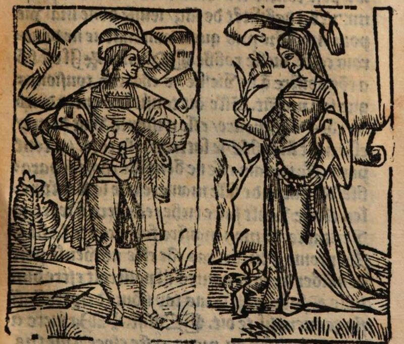 We cannot be certain of which character the left panel depicts, since Calisto, Sempronio, and Pármeno are all included in the sixth act. The figure, dressed in regal attire, is also wearing a hat and has a sword mounted on his belt. To the right we see a female figure. This must be Celestina, since she is the only female character in this act. She is wearing a robe and a veil. In her right hand she is holding a flower, while in her left she is holding the girdle cord hanging from her waist. At her feet, a dog is standing on its hind legs with its front paws extended toward her. Both figures are placed outside.This entire illustration is identical to those found on pages 112 and 171 of the text.Both panels are near carbon-copies of panels found multiple times throughout the earlier 1529 Lyon edition. However, the lower attention to detail in these panels makes it clear that they are reproductions and not duplicates. The artist likely referred to a copy of the 1529 edition when creating these panels.