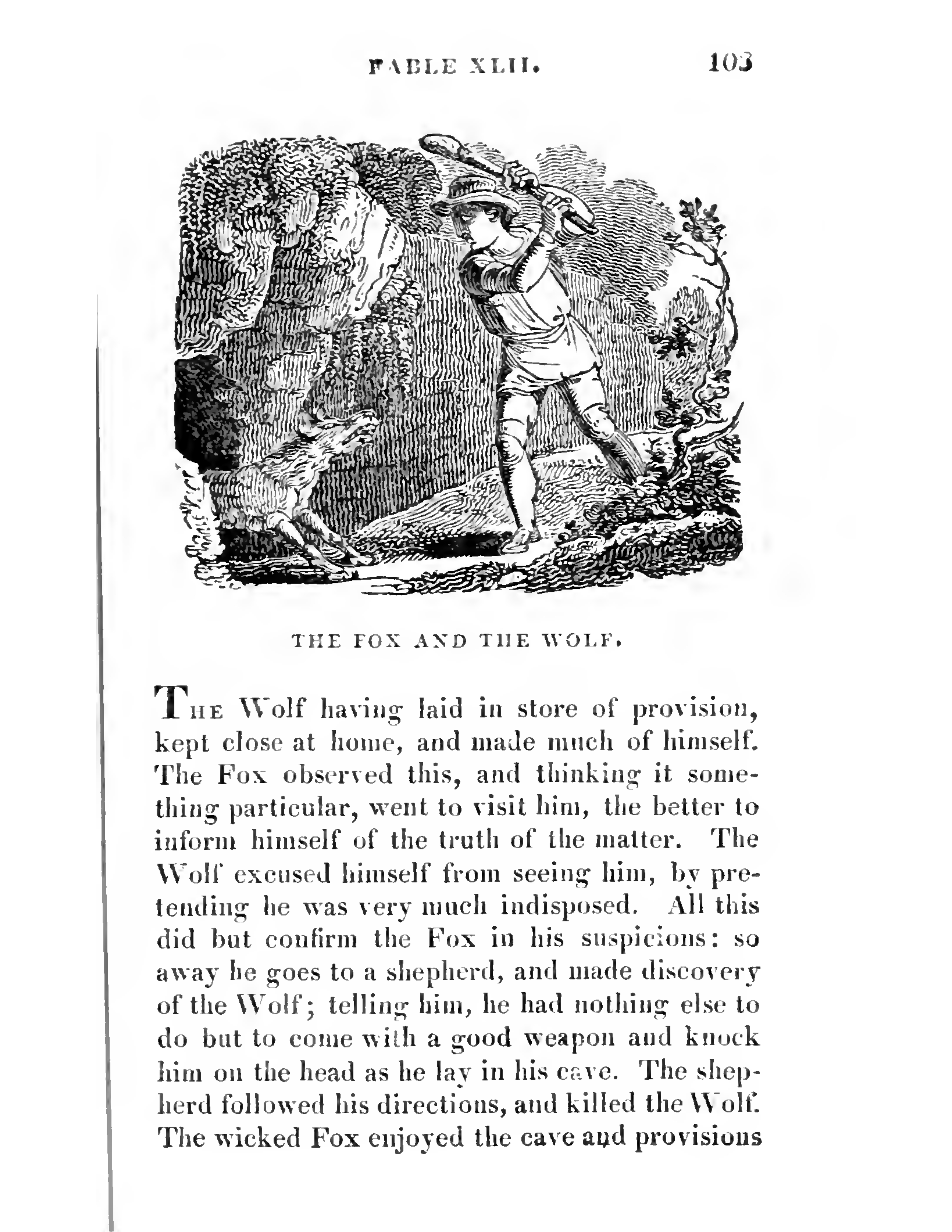 A man is in the centre of the page facing left and looking down at a wolf. The man is holding a club above his head in both hands on his right side. He is wearing a hat and a short tunic. The wolf is baring its teeth, looking up at the man, and is half emerged from a cave in the bottom left corner. Most of the background is filled with rocks and there is a tree on the right side.