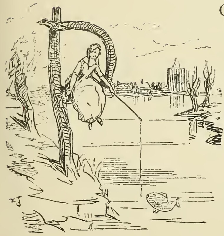 A female figure, representing Becky Sharp, is seated in a wooden letter P of Poor on the banks of a stream or river. She holds in her left hand a fishing rod, which has attracted the attention of a single large fish, representing Joseph Sedley. In the background are several trees and the shapes of buildings in a city or town in the distance.