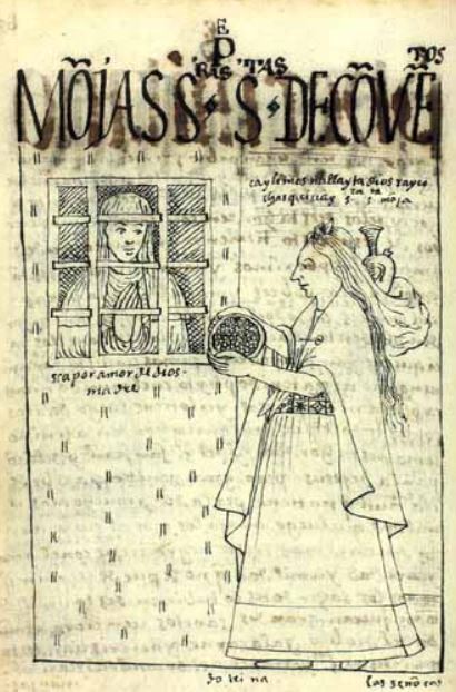This image depicts an indigenous woman approaching a convent. The indigenous woman is illustrated wearing a long dress that has an embroidered waist. She also has a wrap over her head that appears to be carrying items. The indigenous woman is holding a plate of food and offering to the woman in the window. The woman behind the barred window is a nun and she is depicted with her hands together in prayer. There is dialogue written above the indigenous woman’s head which reads, cay limosnallayta diosrayco chasquiuay, senora santa monja [For God, holy nun, receive my alms]. The nun replies, sea por amor de dios, madre [Be it for God’s sake, mother].