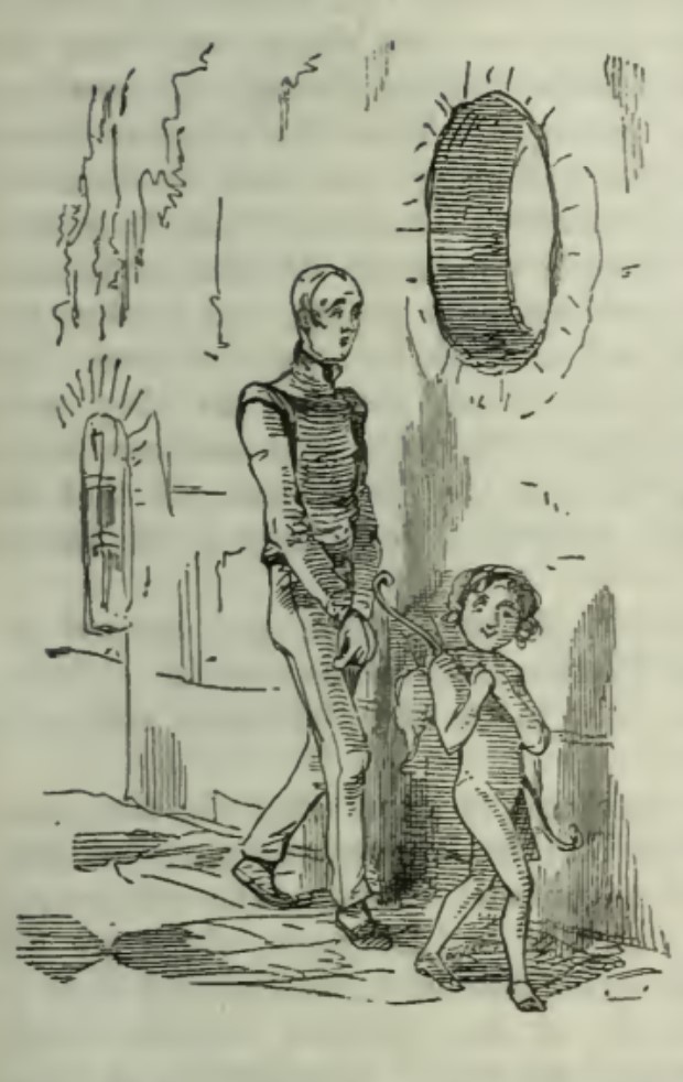 William Dobbin walks along a path next to a high, thick wall, looking shy with his hands clasped in front of him. He is led by a child in the appearance of a cupid, with small wings and a bow. A window high up in the wall forms the letter O from Our.