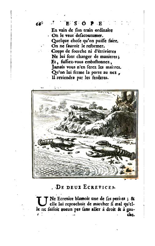 - A crayfish blamed one of her little ones; and she reproached her for walking so badly that she could not take any step without going straight and to the left. Two crayfish on the beach facing each other.