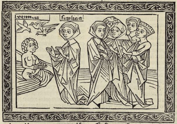 This engraving depicts Sulpicia, a woman renown for her chastity, consecrating a statue of Venus. Sulpicia is depicted on the left side of the engraving with her hands reaching out towards the nude statue of Venus. We know that these figures are Sulpicia and Venus as their names are engraved above their heads. There are doves flying above the statue of Venus as dove’s are known to be one of many symbols of the goddess. There is a group of women depicted behind Sulpicia as they were all chosen as some of the most chaste women of their time, and they all voted for Sulpicia to be the one to consecrate the statue.