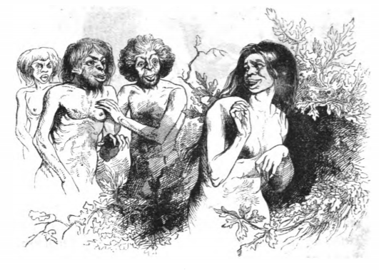 Gulliver’s master explained various aspects of the Yahoos that lived in the Country of the Houyhnhnms. He told Gulliver that female yahoos would sometimes stand behind a bush to watch the males, who would later approach her. The same image appears in the 1843 Krabbe edition.