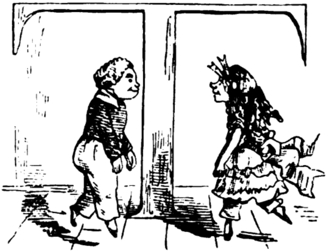 A boy with short curls and a girl with long ringlets and oversized ribbons walk towards each other on tiptoes, both smiling. Between and above them is a large letter T, from The.