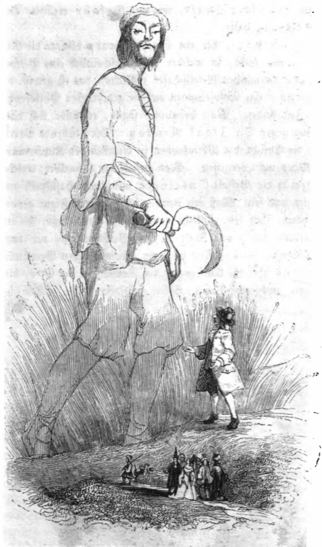 This image is a depiction of Gulliver and the giant farmer who shelters Gulliver in Brobdingnag. The farmer carries a scythe to indicate his position. The image is a part of Swift’s biography which precedes Part One of Gulliver’s Travels.
