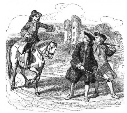 Here we see Gulliver riding on a horse after arriving in England. He waves people out of the way as he rides home. He writes that he felt as though he were on Lilliput because everything felt so small. Thus, he waves people out of the way, fearing he might trample people. Naturally, he received several strange looks from people walking along the road, which can be seen in the image. The same image appears in the 1839 Krabbe edition.