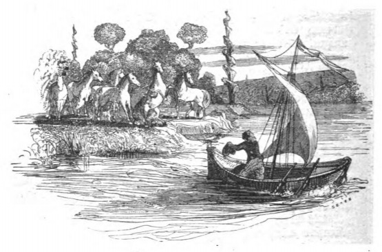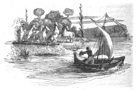 Here we see Gulliver waving to the Houyhnhnms he lived with during his time on the Country of the Houyhnhnms as he sails away. The Council of the Houyhnhnms told his master that Gulliver either had to live with the yahoos or return to Europe but could not live with the Houyhnhnms any longer. Gulliver was shocked by this, and decided he had to leave rather than live with the yahoos. Gulliver sails away in a small sailboat that he built with the help of the Sorrel Nag during his last two months in the Country of the Houyhnhnms. The same image appears in both the 1839 and 1843 Krabbe editions.